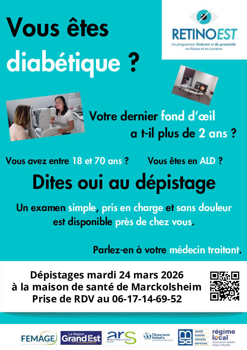 Le programme de dépistage de la rétinopathie diabétique propose un dépistage gratuit le 24 mars 2026 à la maison de santé de Marckolsheim.