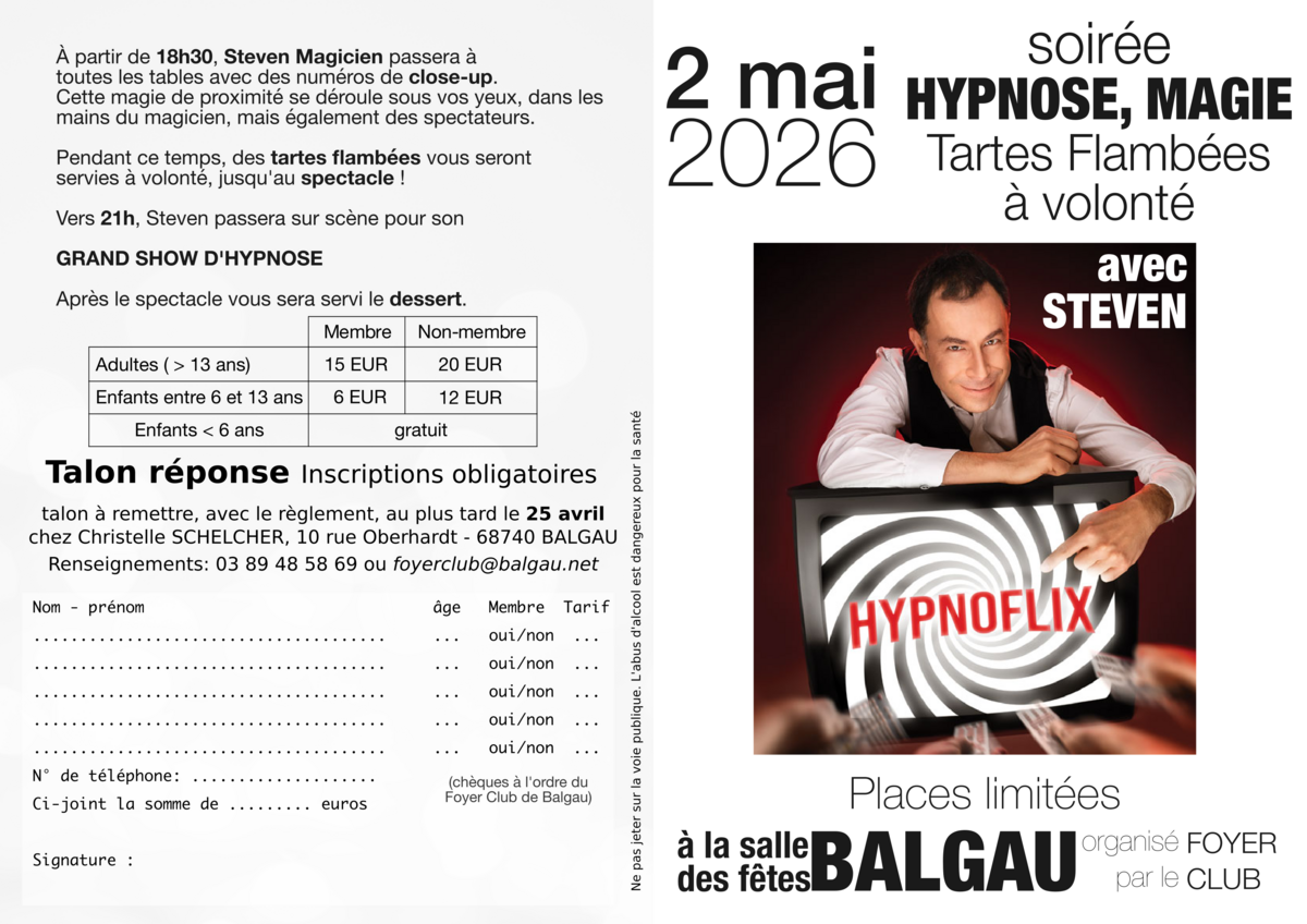Inscrivez vous à la✨ soirée magie et hypnose ✨organisée par le Foyer Club ce samedi 02 mai et