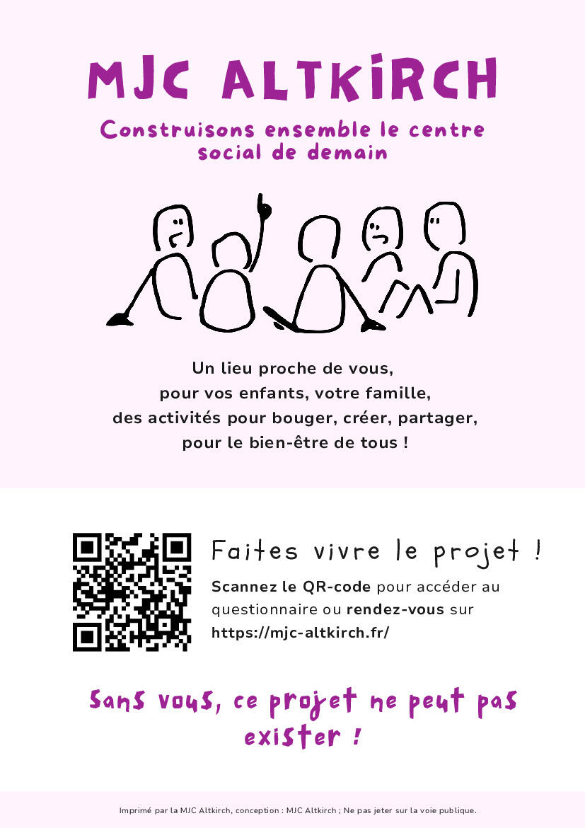 Dans le cadre de l’agrément en Centre Social de la MJC Altkirch, nous construisons actuellement notre Projet Social, visant à identifier et répondre aux besoins et attentes des habitants du territoire. A partir de ce diagnostic, trois axes majeurs d’intervention seront définis pour les quatre prochaines années : il est donc crucial de cerner clairement les besoins prioritaires pour proposer une ressource locale juste et cohérente.