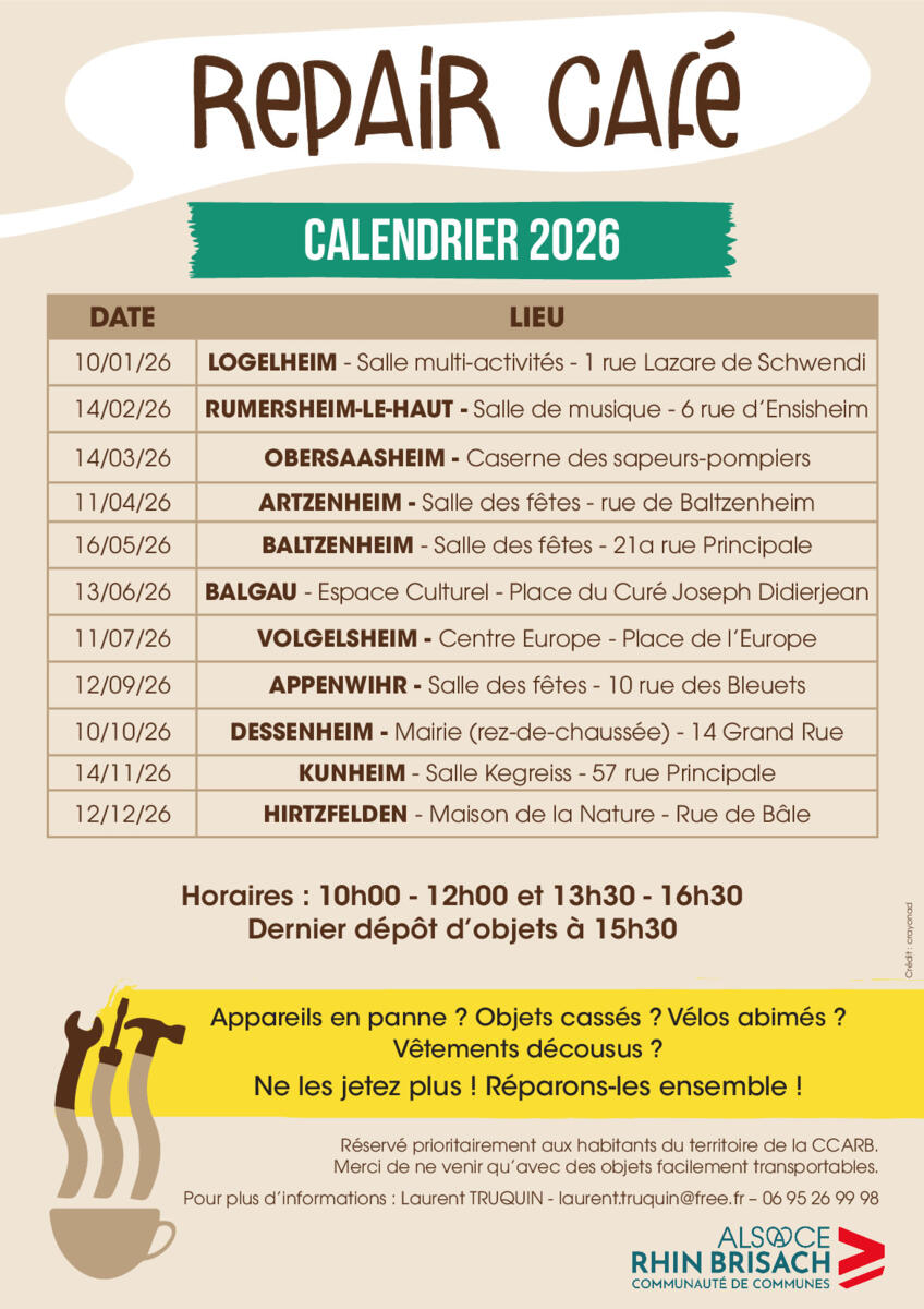 Vous trouverez ci-joint le calendrier Repair Café de l'année 2026