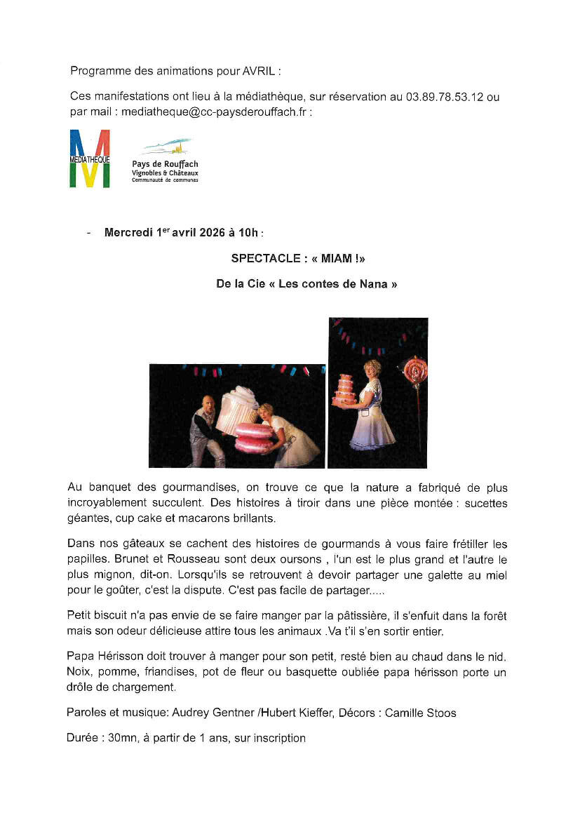 Programme Médiathèque AVRIL 2026 24/03/2026 Le programme des animations de la Médiathèque pour AVRIL est paru