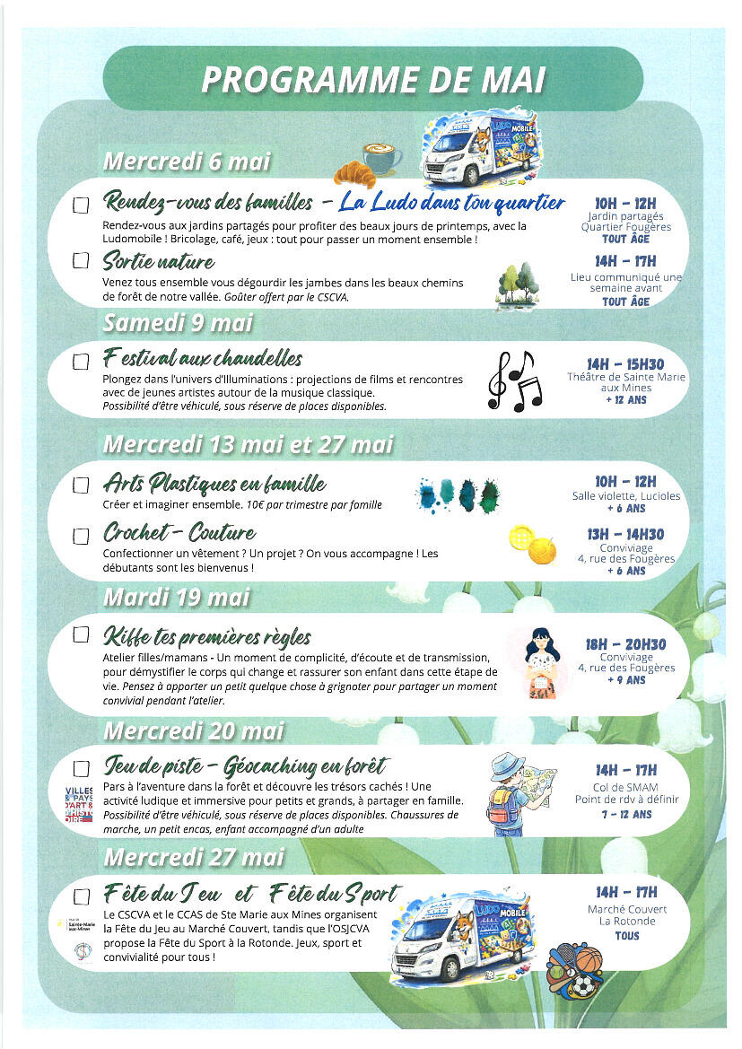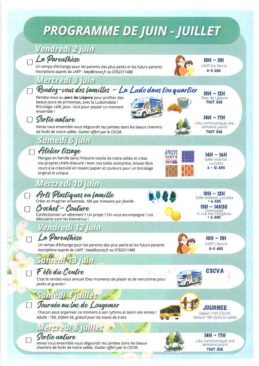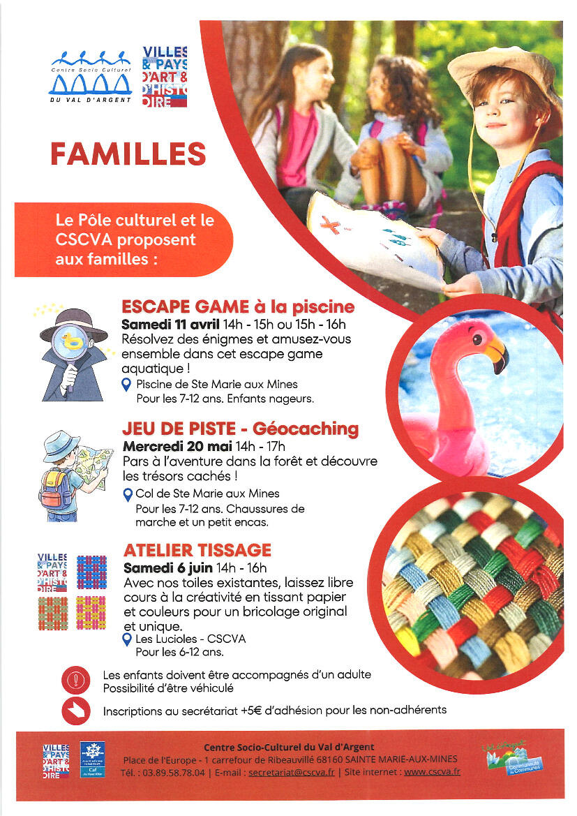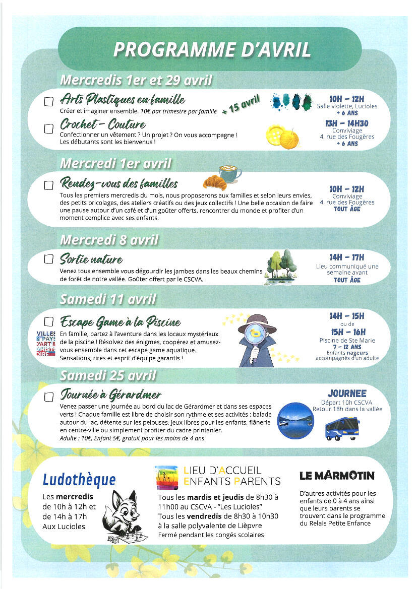 De avril à juillet 2026, le CSCVA et ses partenaires vous proposent un programme d’activités à vivre en famille :
