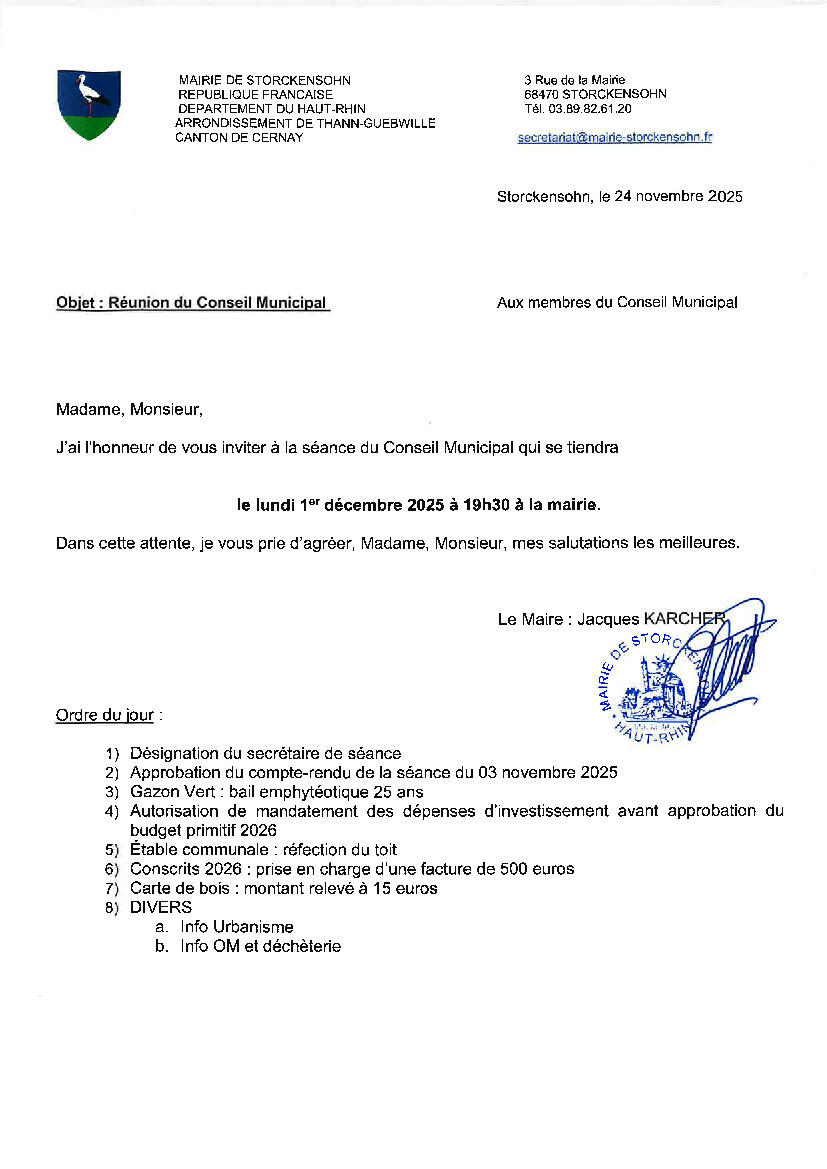 01.12.2025 : Conseil Municipal 25/11/2025 Le prochain conseil municipal se tiendra le : Lundi 1er décembre à 19h30 à la Mairie