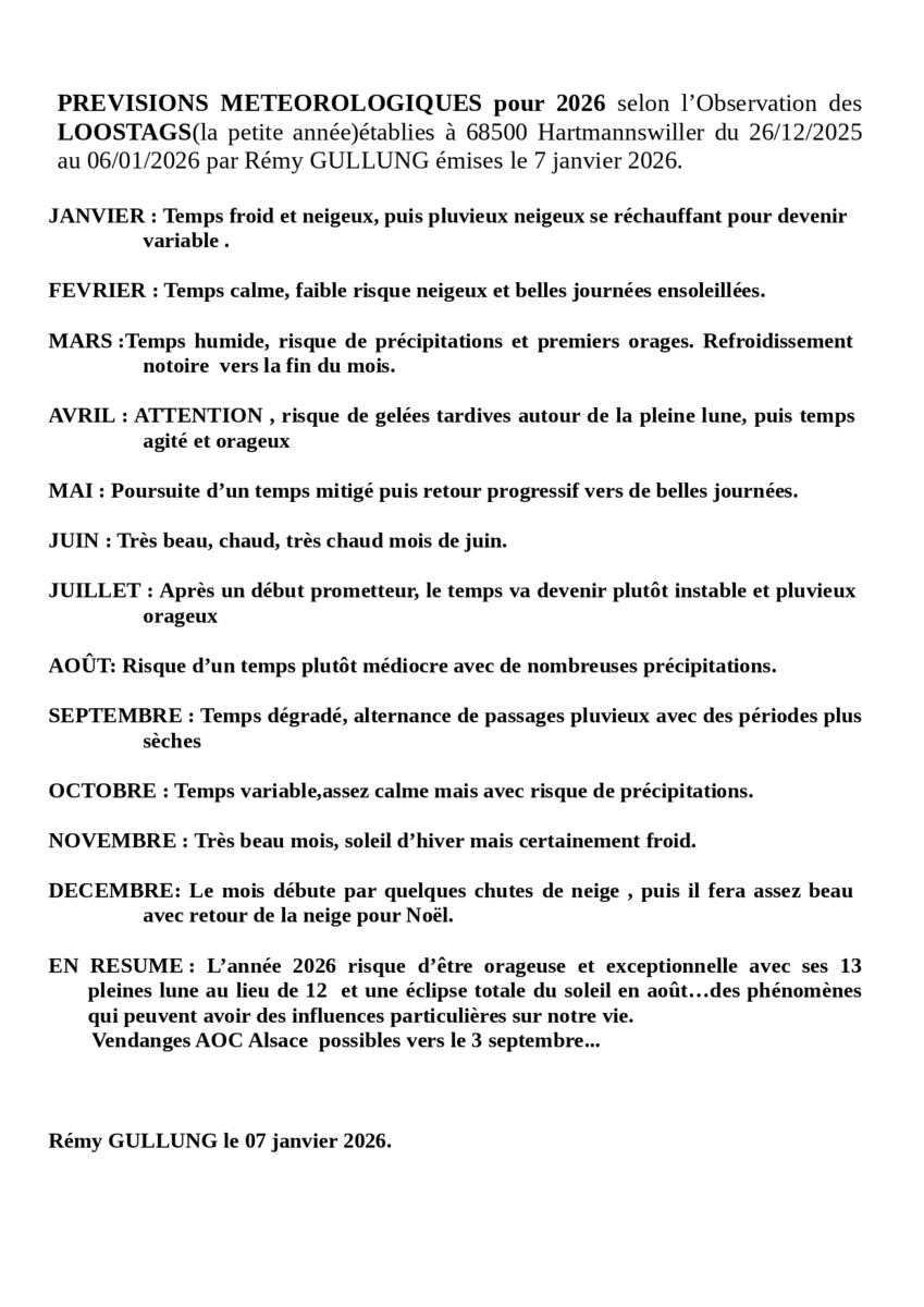 Comme chaque année du 26 décembre au 6 janvier, les Loostags sont établis par Rémy GULLUNG habitant de Hartmannnswiller dans le Haut-Rhin. Fort de son expérience, il nous a donné à maintes reprises des prévisions quasiment fiables année après année.