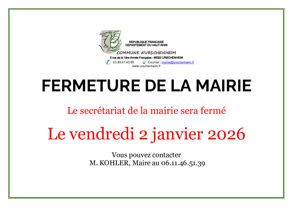 Fermeture du secrétariat de mairie le vendredi 2 janvier