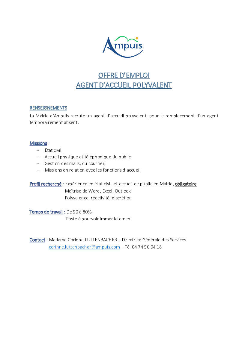 OFFRE D'EMPLOI Mairie d'Ampuis - Agent d'accueil polyvalent