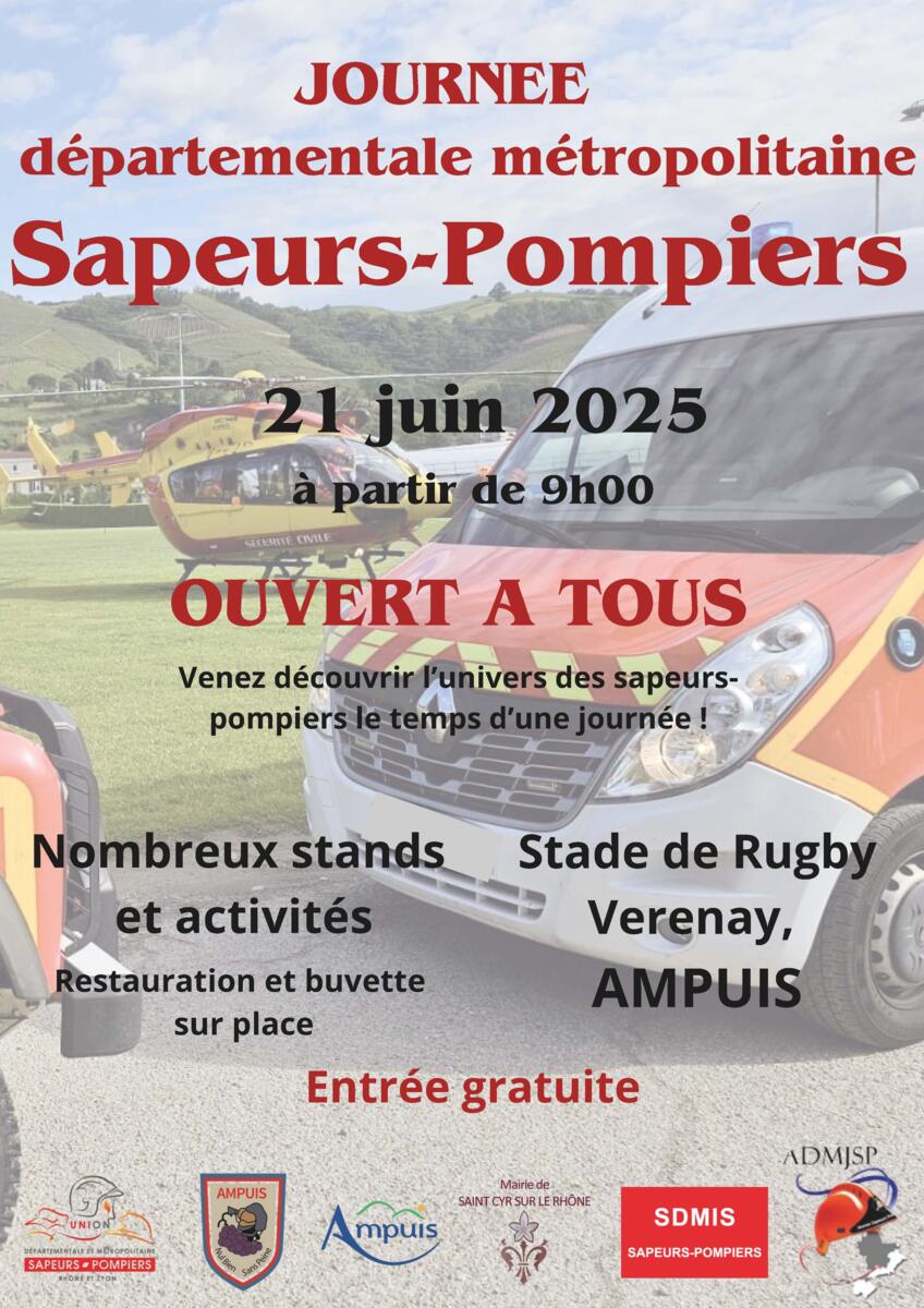 Samedi 21 juin 2025, les sapeurs-pompiers d'Ampuis organisent sur le site du stade de rugby à Vérenay, la journée départementale et métropolitaine des sapeurs-pompiers (JDMSP). Cette manifestation d'ampleur permet de réunir les sapeurs-pompiers du département sur une journée et de faire découvrir leurs activités et spécialités à la population.