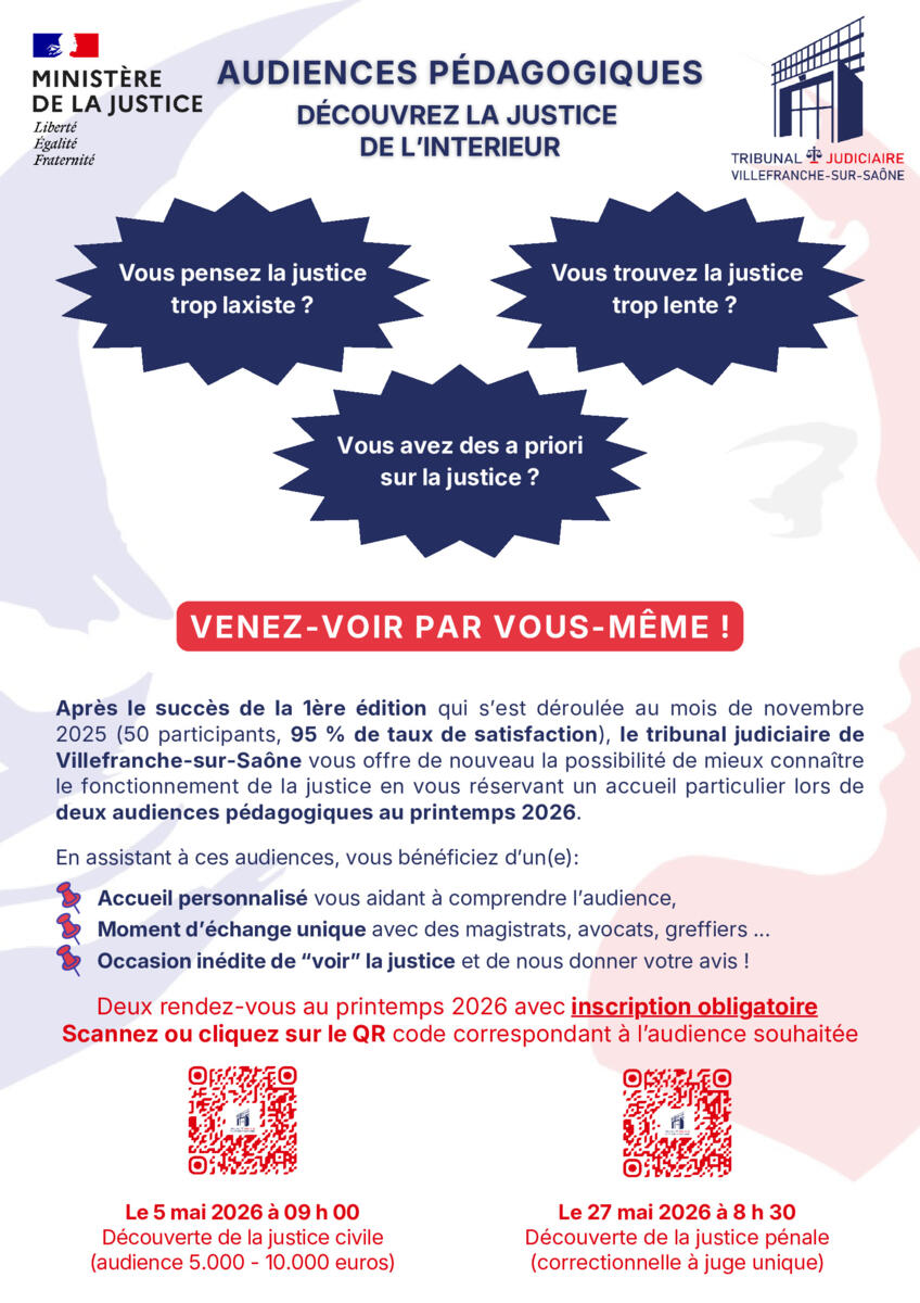 • Le 5 mai 2026 à 09 h  - Audience pour les contentieux civils compris entre 5.000 et 10.000 euros (justice civile)