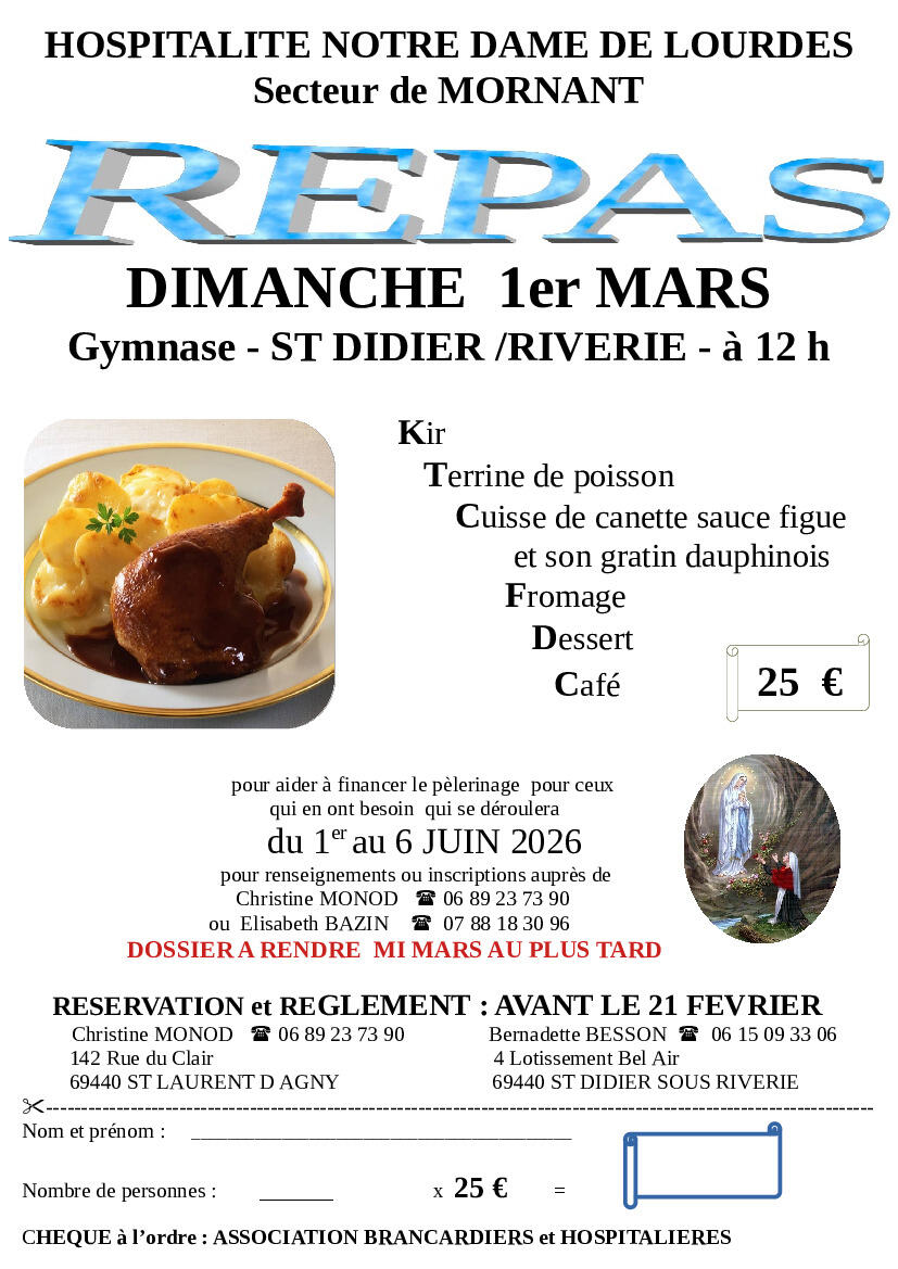 L'Association des brancardiers et hospitalières de Mornant organise un repas le dimanche 1er mars 2026 à Chabanière - Saint Didier sous Riverie.