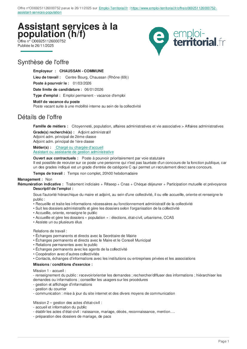 Détails de l'offre sur le document joint ou https://www.emploi-territorial.fr/offre/o069251126000752-assistant-services-population