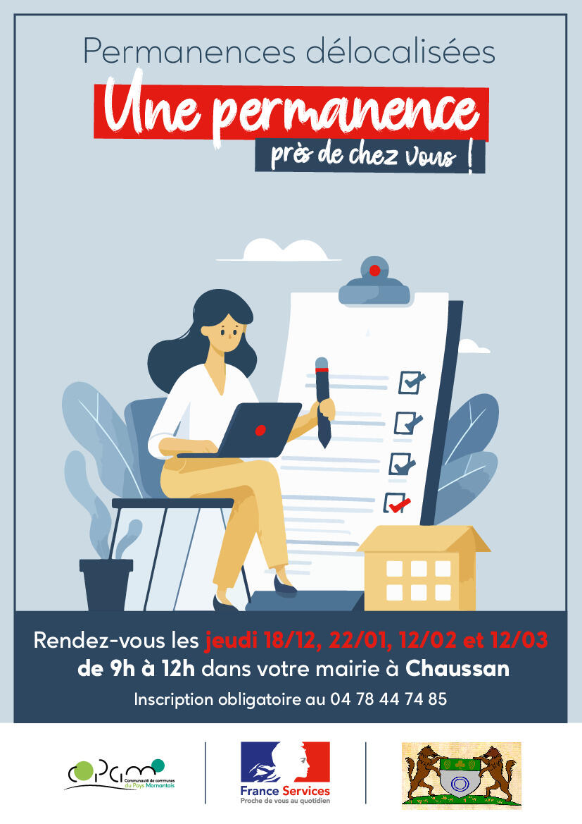 France Services - Permanences A Chaussan 29/01/2026 Les prochaines dates de permanence FRANCE SERVICES à CHAUSSAN, de 9h à 12h sont : - jeudi 12 février 2026 - jeudi 12 mars 2026 Rendez-vous en mairie - inscription obligatoire au 04 78 44 74 85 Document joint.