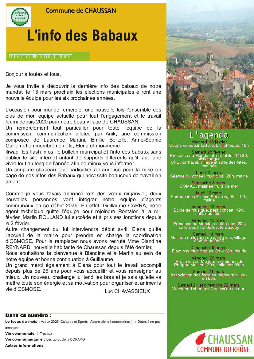 Info Des Babaux De Fevrier 2026 20/02/2026 Découvrez ci-joint la nouvelle édition de "l'info des Babaux". Bonne lecture.