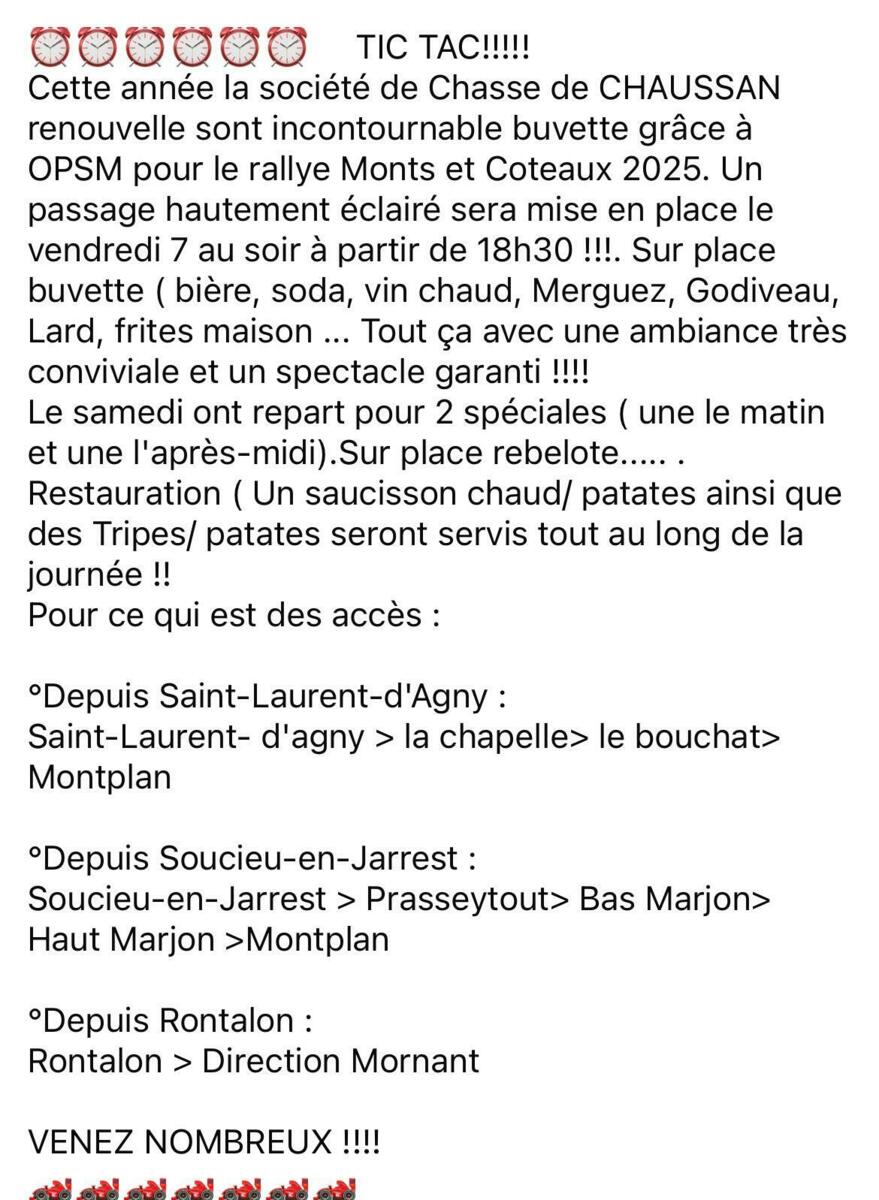 Cette année la Société de Chasse de Chaussan renouvelle sa buvette pour le rallye Monts et Coteaux de ce week-end.
