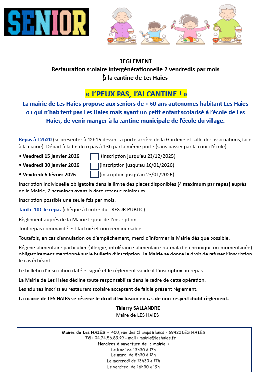 La municipalité poursuit l'expérience de prise de repas des ainés à la cantine du village et propose aux personnes de +60 ans habitant Les Haies mais aussi aux non habitants de +60 ans mais ayant un petit enfant scolarisé à l'école des Haies, de pouvoir partager le repas de midi à la cantine municipale avec les enfants de l'école du 2ème service (CE et CM).