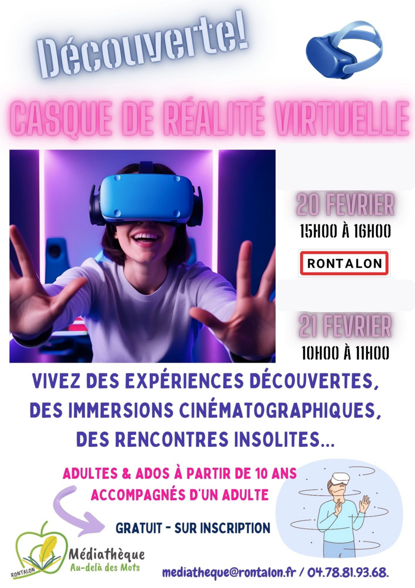 Venez découvrir le casque de réalité virtuelle à la médiathèque le 20 février de 15h à 16h00 et le 21 février de 10h00 à 11h00.