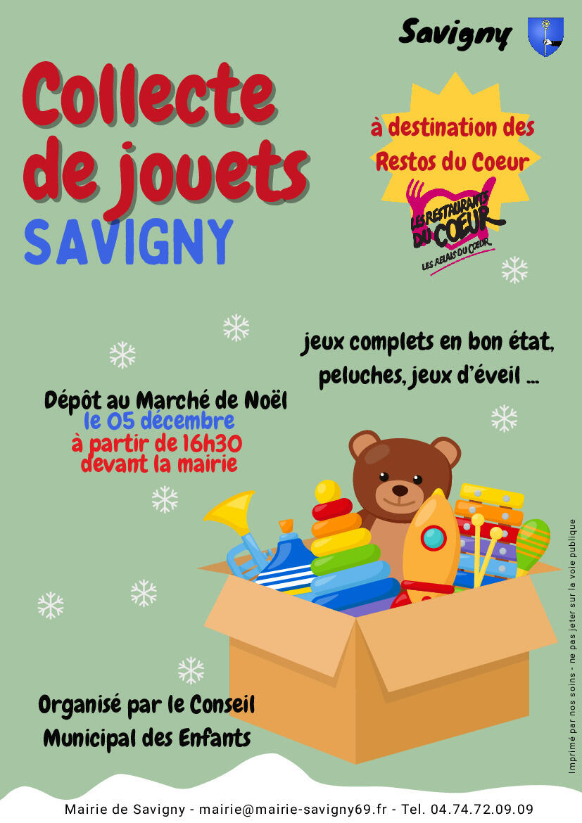 Collecte De Jouets 26/11/2025 Collecte de jouets organisée par le Conseil municipal des enfants au profit des Restaurants du Coeur Dépôt lors du marché de Noël Vendredi 5 décembre à partir de 16h30 devant la mairie Jeux complets et en bon état (peluches, jeux d'éveil...)