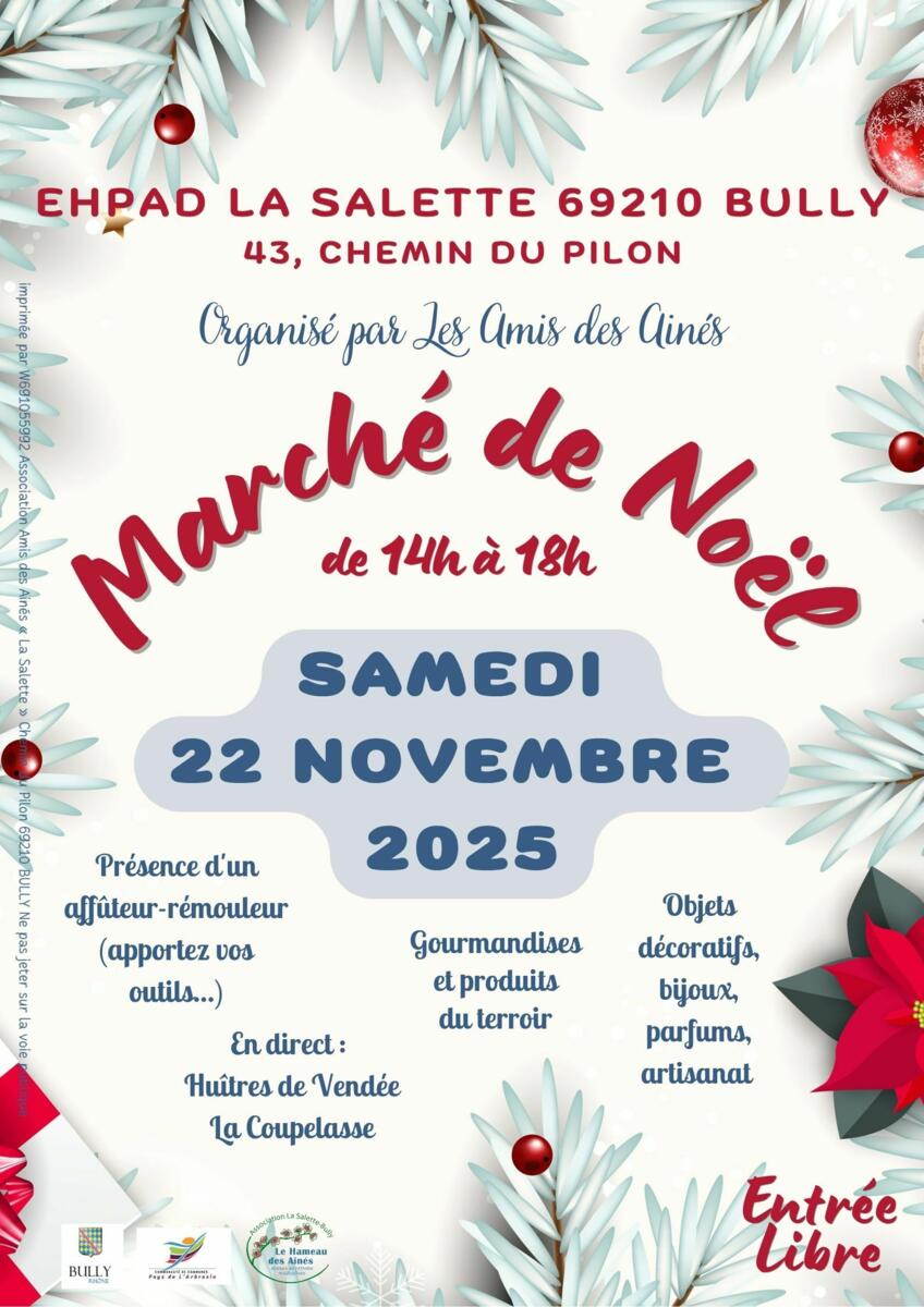Marché De Noël Ehpad La Salette 17/11/2025 Marché de Noël à l'ehpad de la Salette (Bully) le samedi 22 novembre 2025, de 14h à 18h.