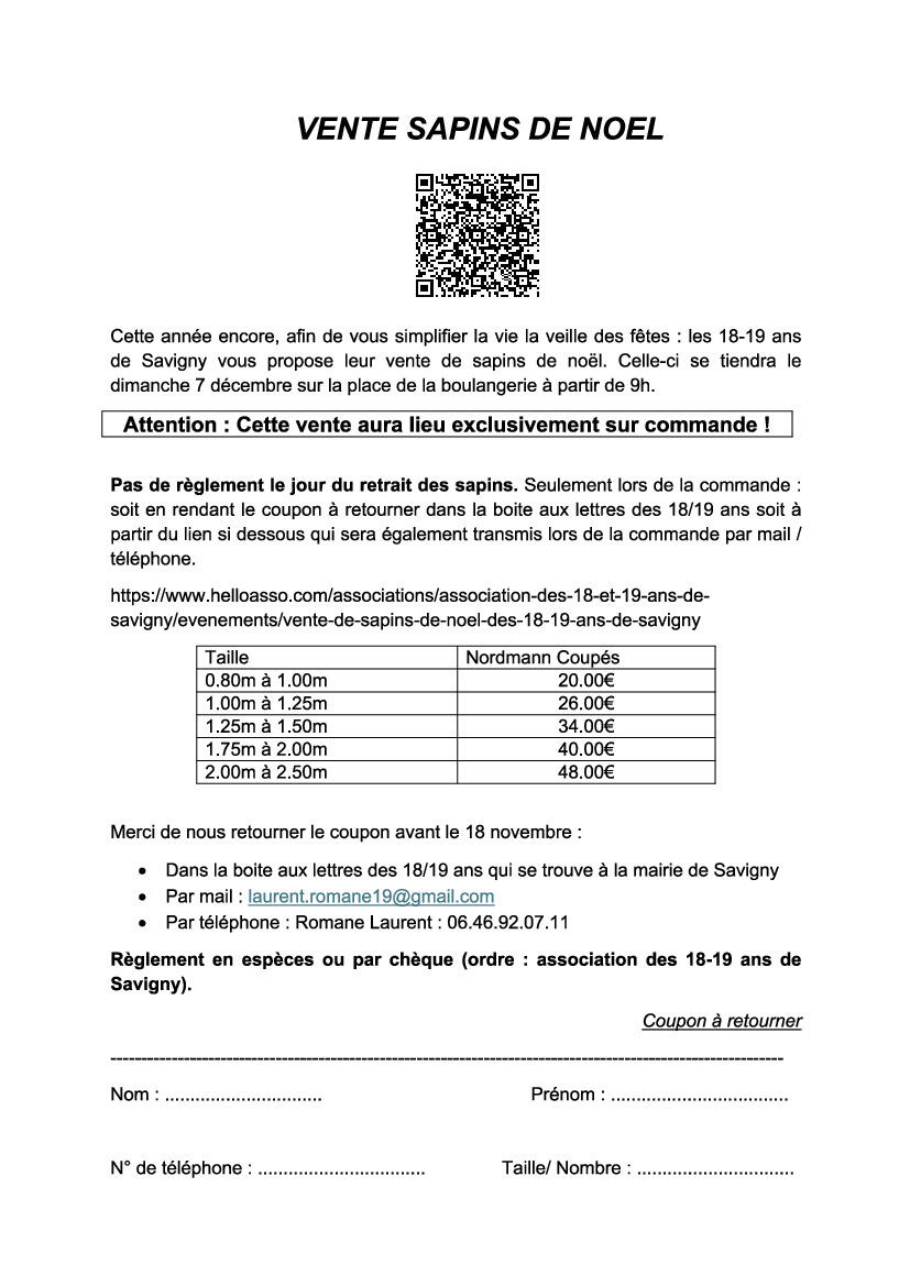 👉 Les réservations des sapins sont à rendre avant le 18 novembre dans la boîte aux lettres des 18/19ans, par mail ou par téléphone  (voir bon de commande)