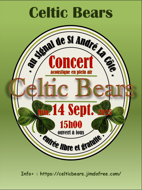 Ce dimanche 14 septembre 2025 à 15h00, aura lieu le concert acoustique du groupe Celtic Bears, en plein air, en haut du Signal de Saint-André-la-côte.