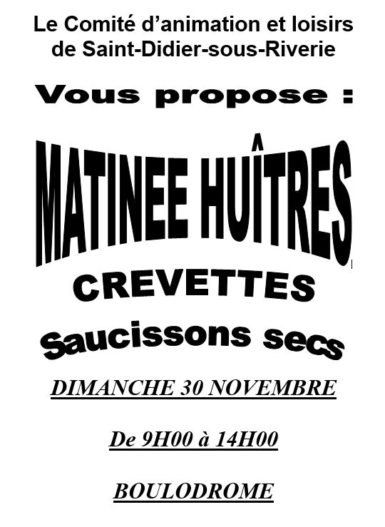 Le comité d’animation de Saint-Didier vous donne rendez-vous pour sa traditionnelle matinée huîtres – crevettes – saucisson secs dimanche 30 novembre 2025.
