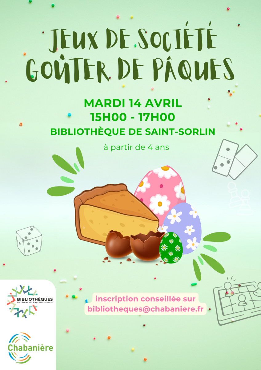 Une après-midi conviviale et gourmande : jeux de société et goûter de Pâques de 15h00 à 17h00 à la bibliothèque de St-Sorlin.