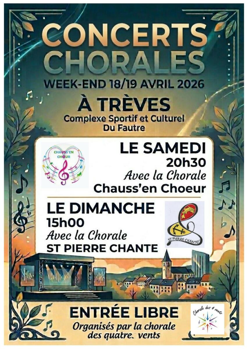Chorale Des Quatre Vents 01/04/2026 Elle donnera son concert annuel : - Le samedi 18 avril à 20h30 - Le dimanche 19 avril à 15h00 Les premières parties seront assurées par les chorales de Chaussan et Saint Pierre de Bœuf