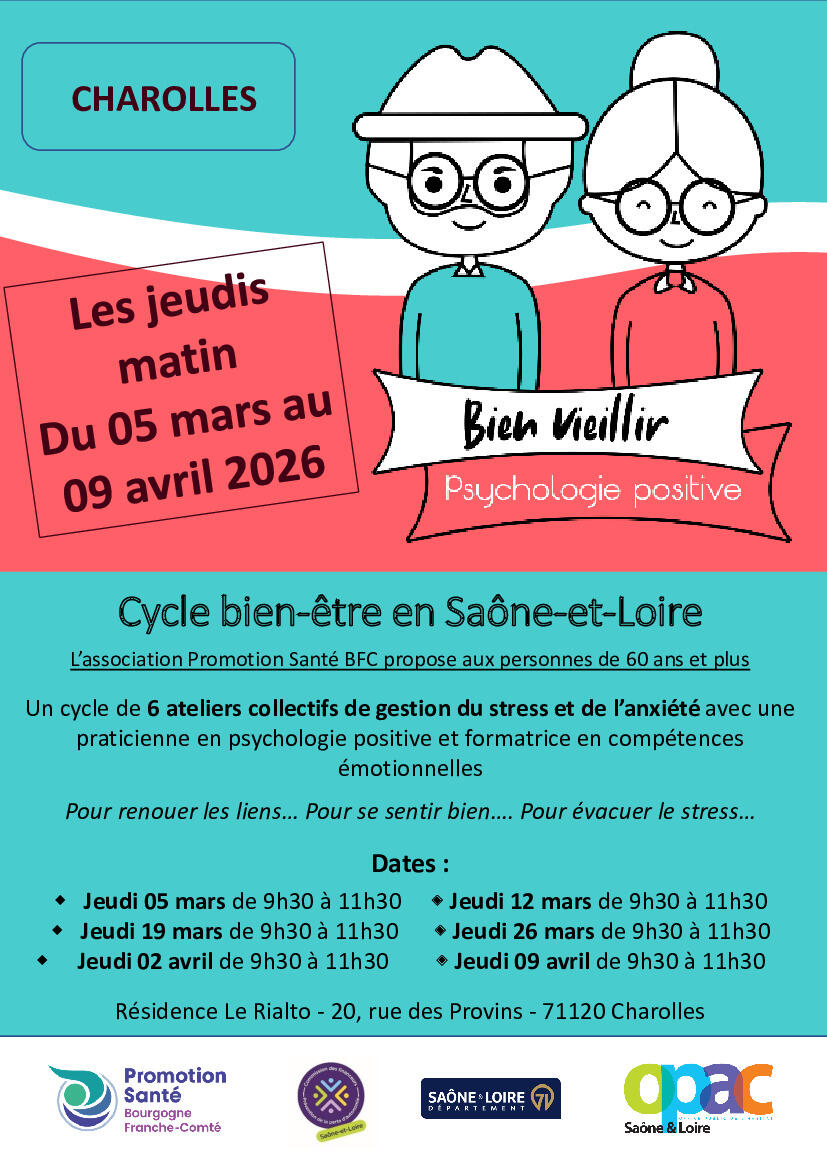 👉Dans le cadre d’un projet de prévention santé, l'association Promotion Santé BFC- antenne 71n en partenariat avec le Rialto, met en place son programme « Bien vieillir » à destination des personnes âgées de plus de 60 ans du territoire, pour renouer les liens…, pour se sentir bien…, pour évacuer le stress….