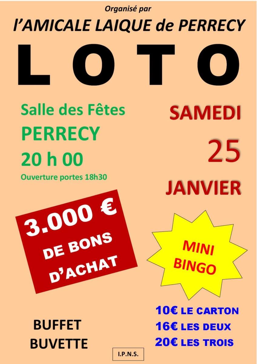 Les membres de l'Amicale Laïque de Perrecy vous attendent nombreux à leur loto qui aura lieu le  SAMEDI 25 JANVIER A PARTIR DE 18H30.