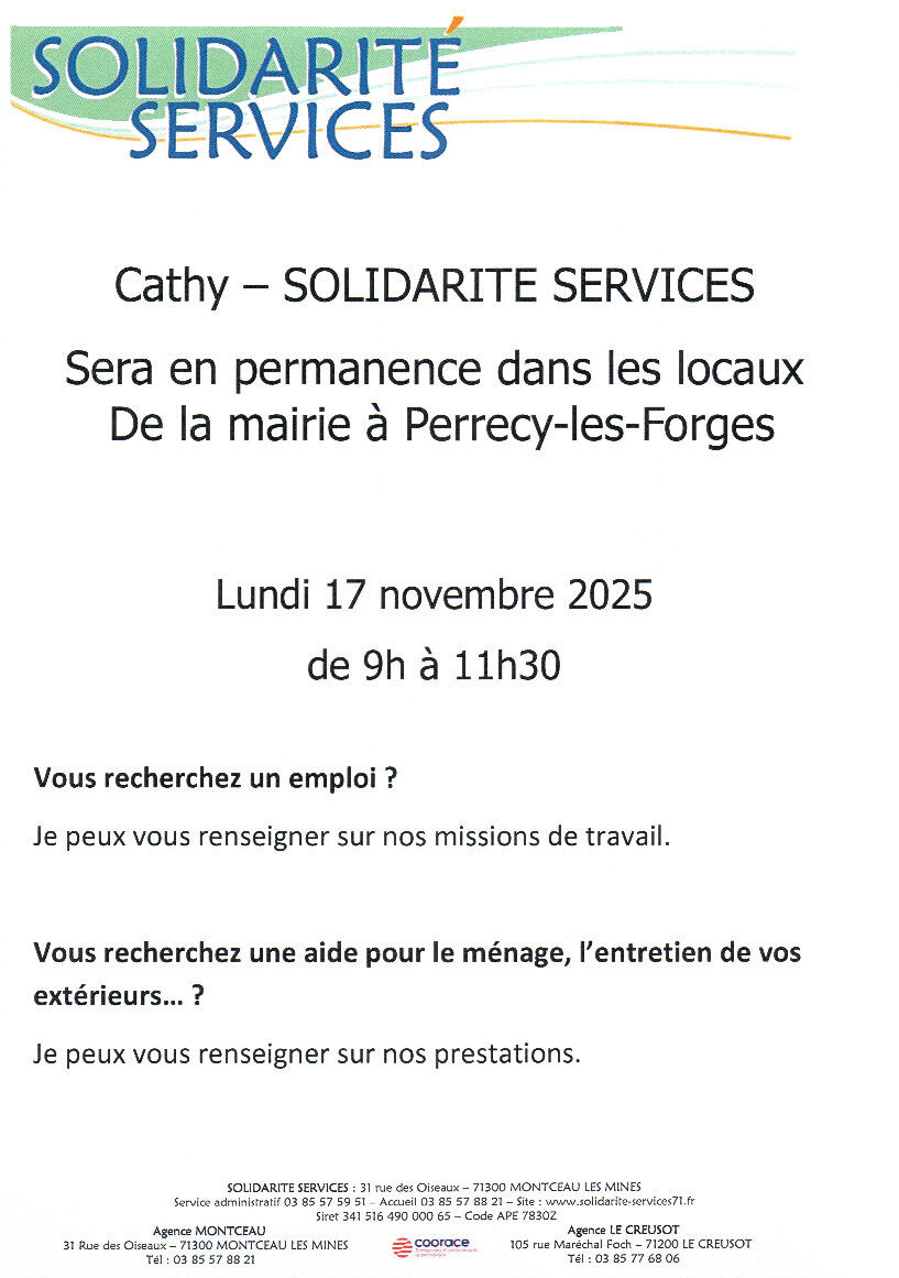 La prochaine permanence de SOLIDARITE SERVICES aura lieu en mairie