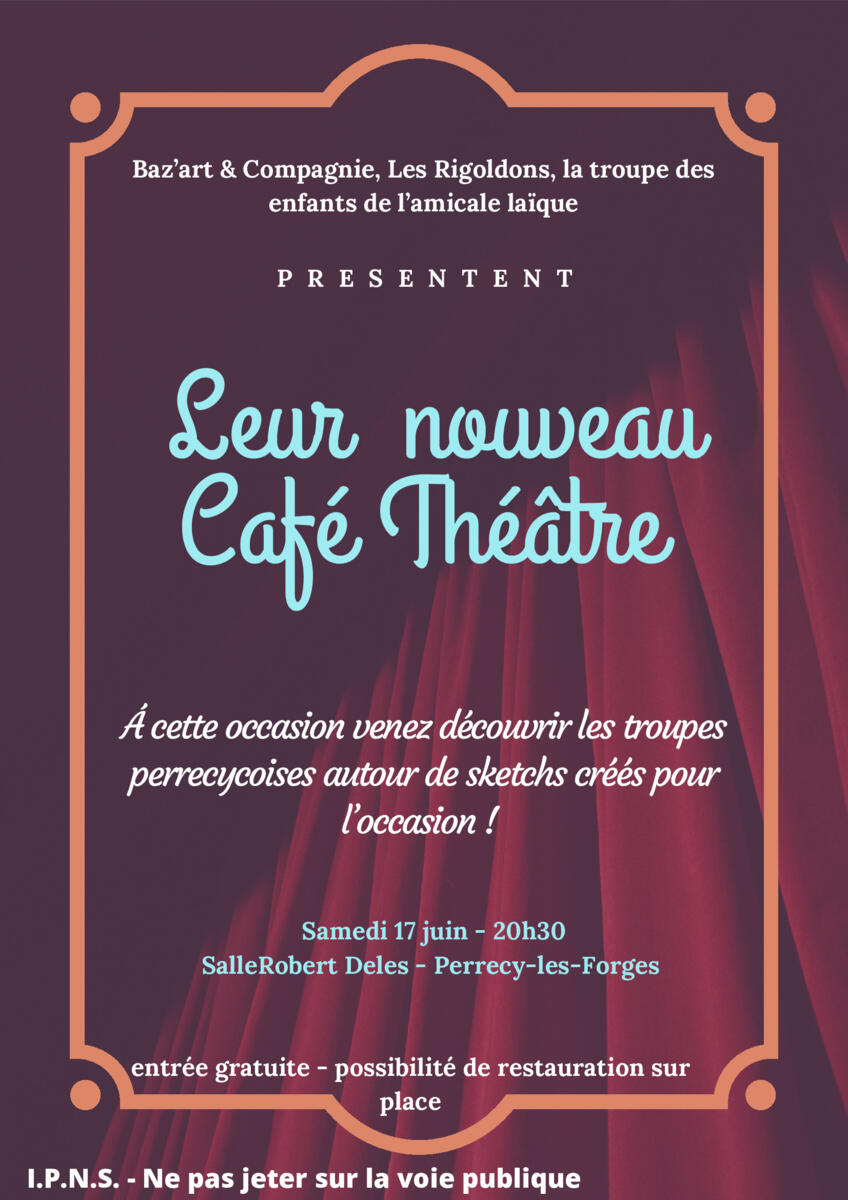 Les Rigoldons, Baz'art&Cie et la troupe théâtre des enfants de l'Amicale Laïque vous invitent à leur soirée Café Théâtre le samedi 17 juin à 20h30 à la salle des fêtes de Perrecy.