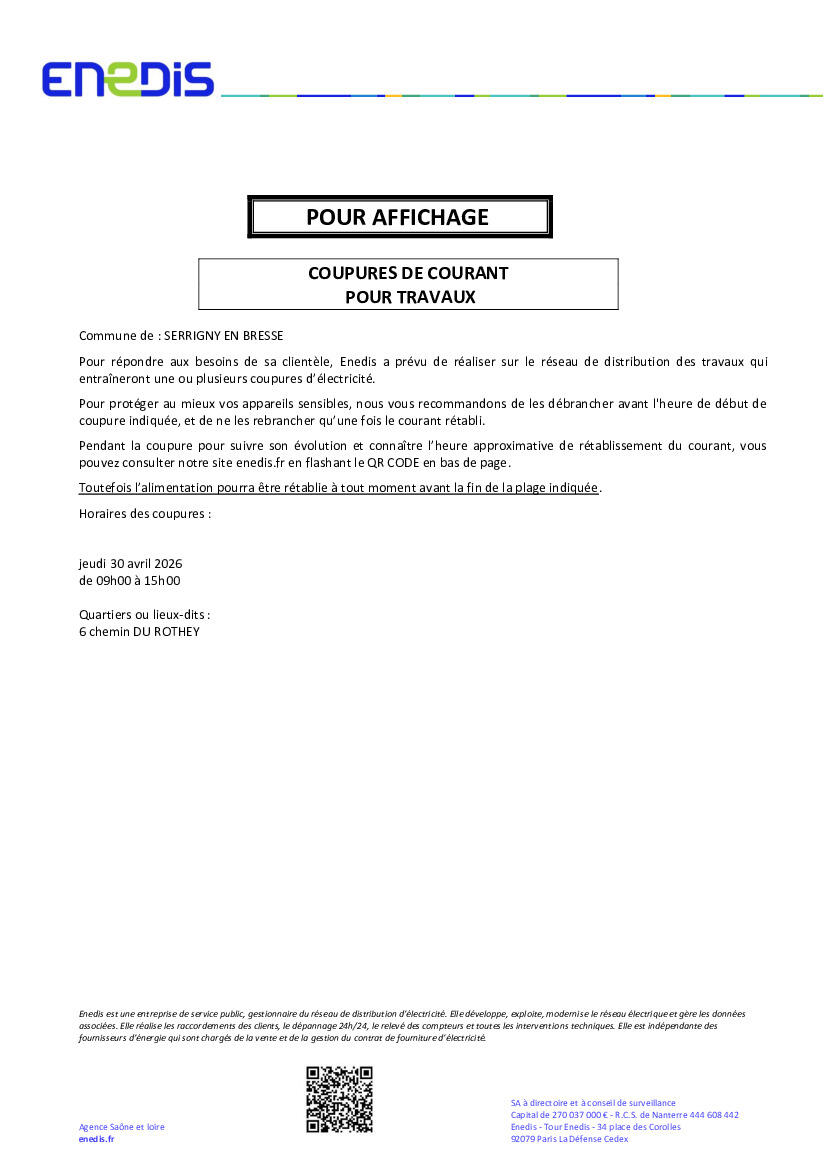 Votre mairie / Actualités / Coupure d’électricité – SERRIGNY-EN-BRESSE