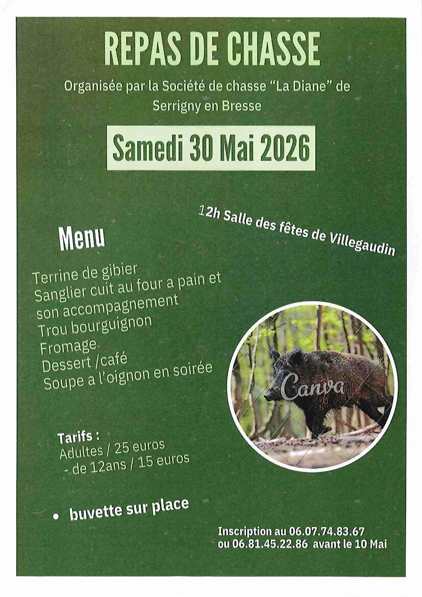 Retrouvez toutes les informations utiles pour vous inscrire au repas de la chasse organisé par la société de chasse La Diane de Serrigny-en-Bresse.