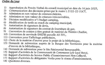 Le conseil se réunit le 21 juillet 2025 à 20h30 salle du conseil municipal.