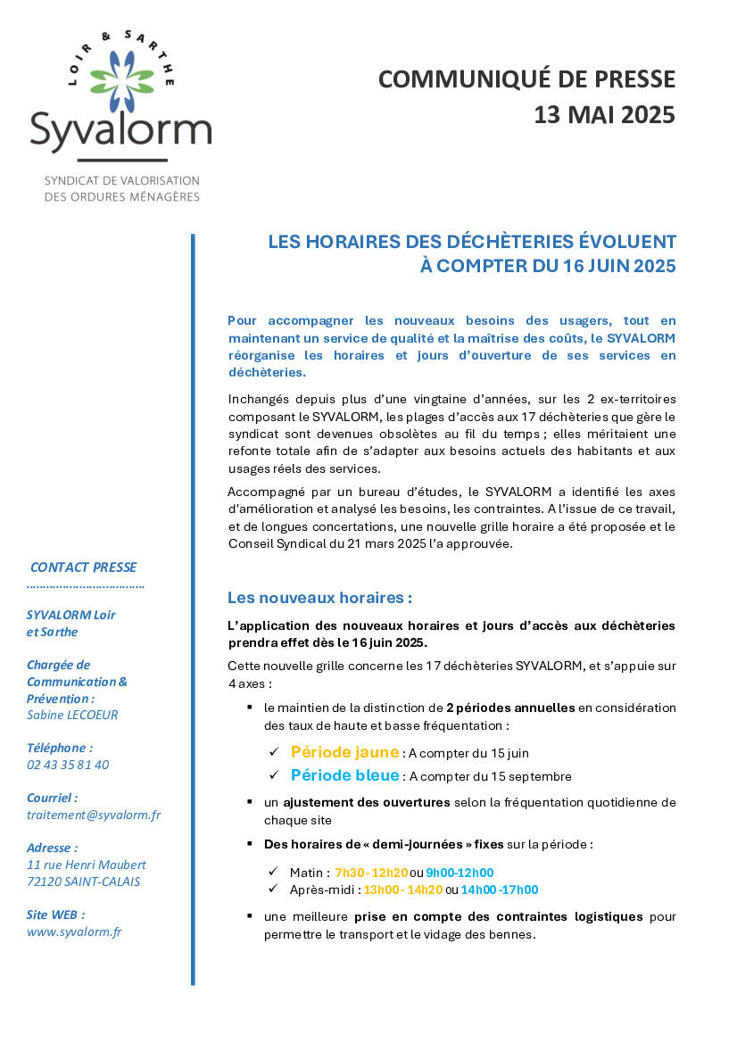 Votre mairie / Actualités / Déchèteries SYVALORM : évolution des horaires