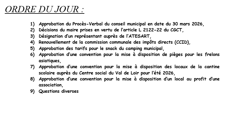 Le Conseil Municipal se réunira le lundi 27 avril 2026 à 20h30, en salle du Conseil Municipal.