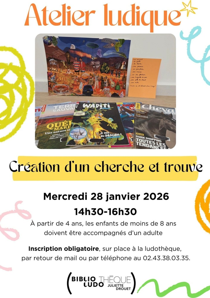 - le mercredi 28 janvier, de 14h30 à 16h30 : création d'un jeu "cherche et trouve" ! A partir de découpages, vous pourrez créer votre propre jeu de cherche et trouve pour s'amuser en familles ou entre amis ! Dans le cadre du temps fort Grandimages.