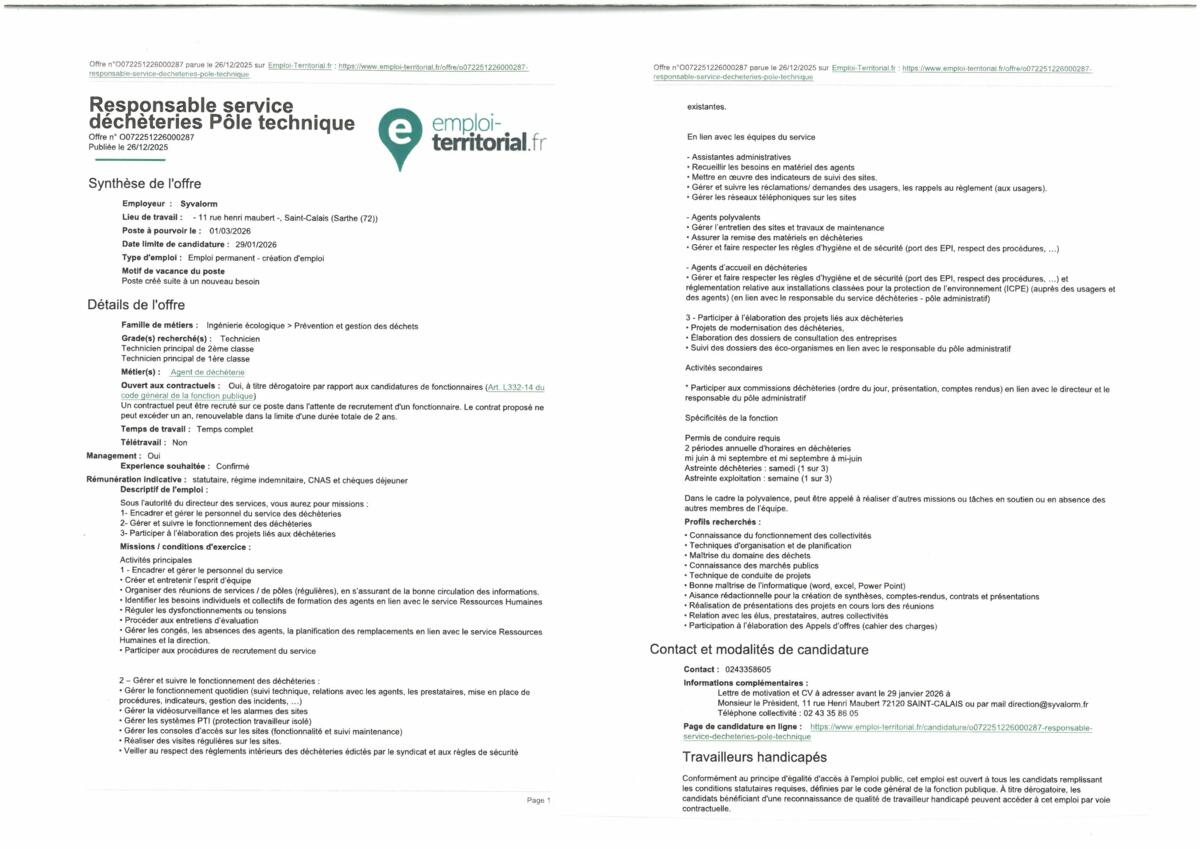 Offre d'emploi responsable service déchèteries