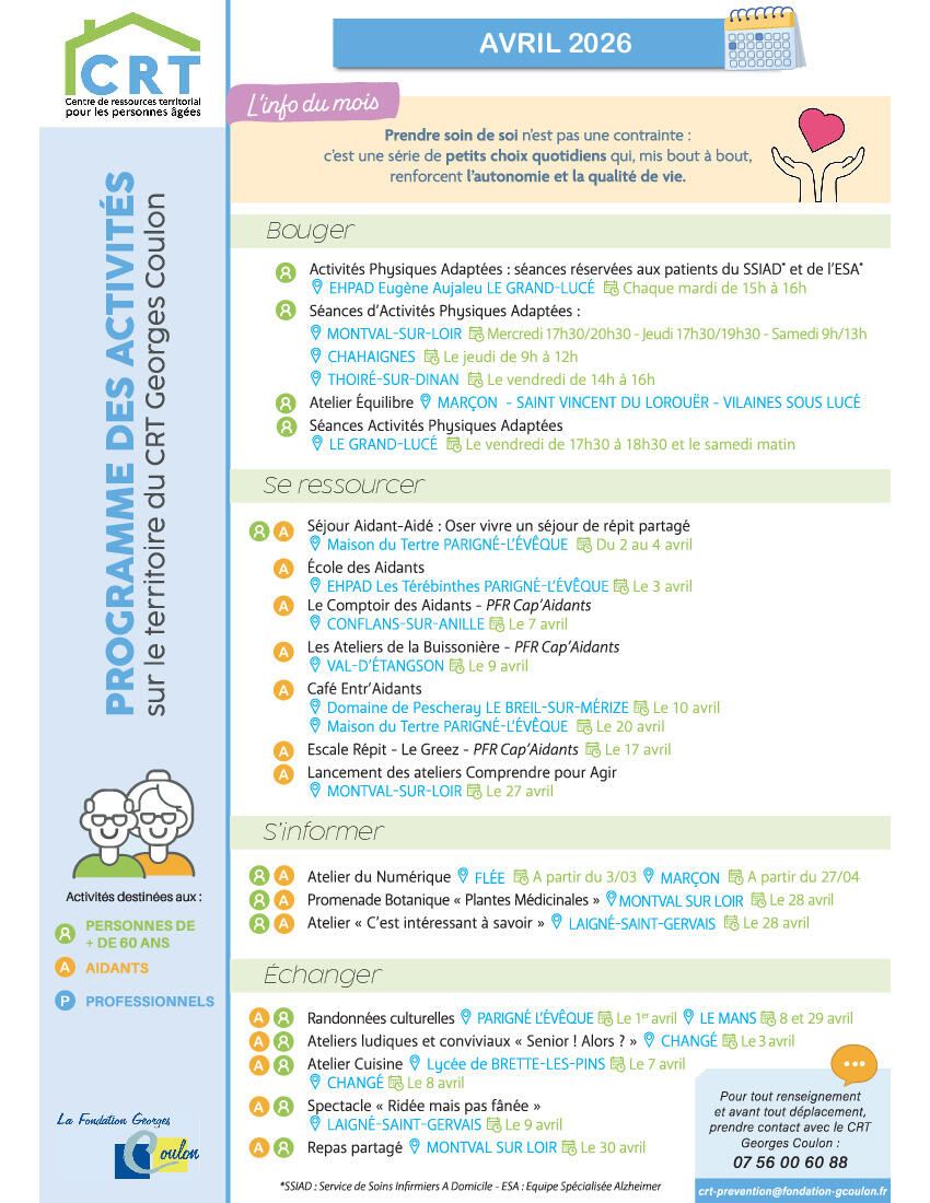 Veuillez trouver ci-dessous le programme des activités organisées par le CRT Georges Coulon pour le mois d'avril 2026.