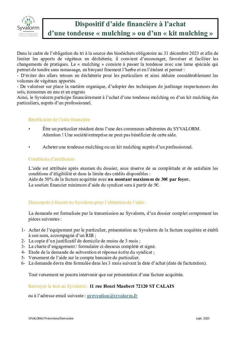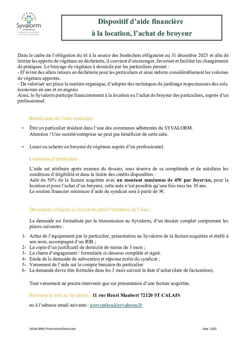 Toutes les infos utiles et les formulaires de demande d'aides sont sur le site internet du Syvalorm ou disponibles en mairie.