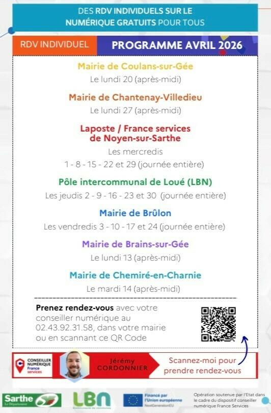 La communauté de communes de Loué-Brûlon-Noyen vous propose tout au long du mois d'avril 2026 des cours individuels pour développer vos connaissances et vos compétences en outils numériques.