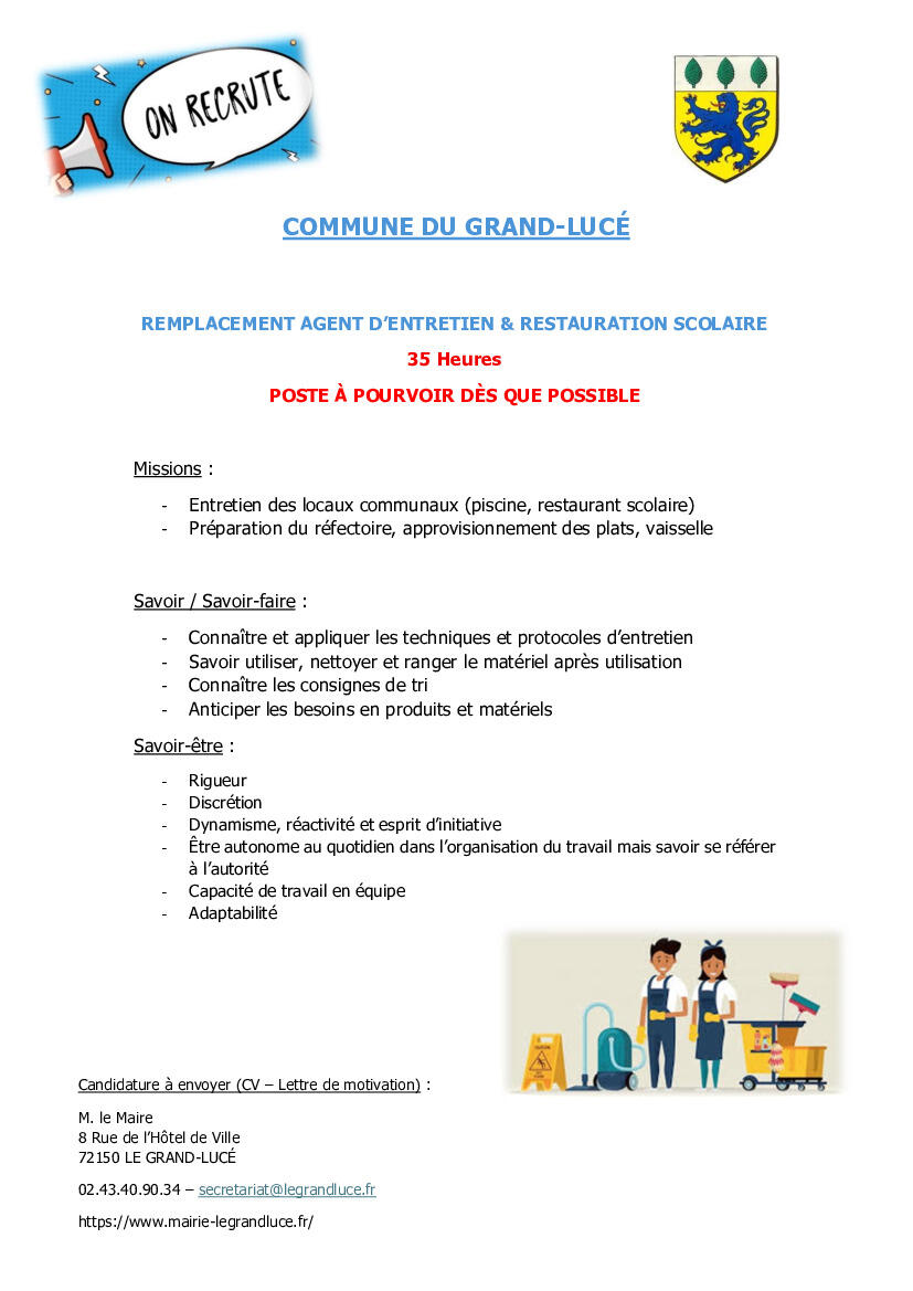 Votre mairie / Actualités / Recrutement agent d'entretien & restauration scolaire