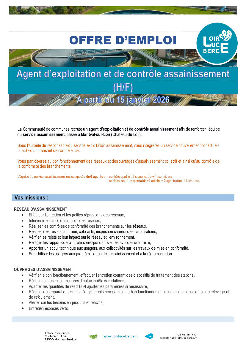 Votre mairie / Actualités / OFFRE D'EMPLOI : AGENT D'EXPLOITATION ASSAINISSEMENT
