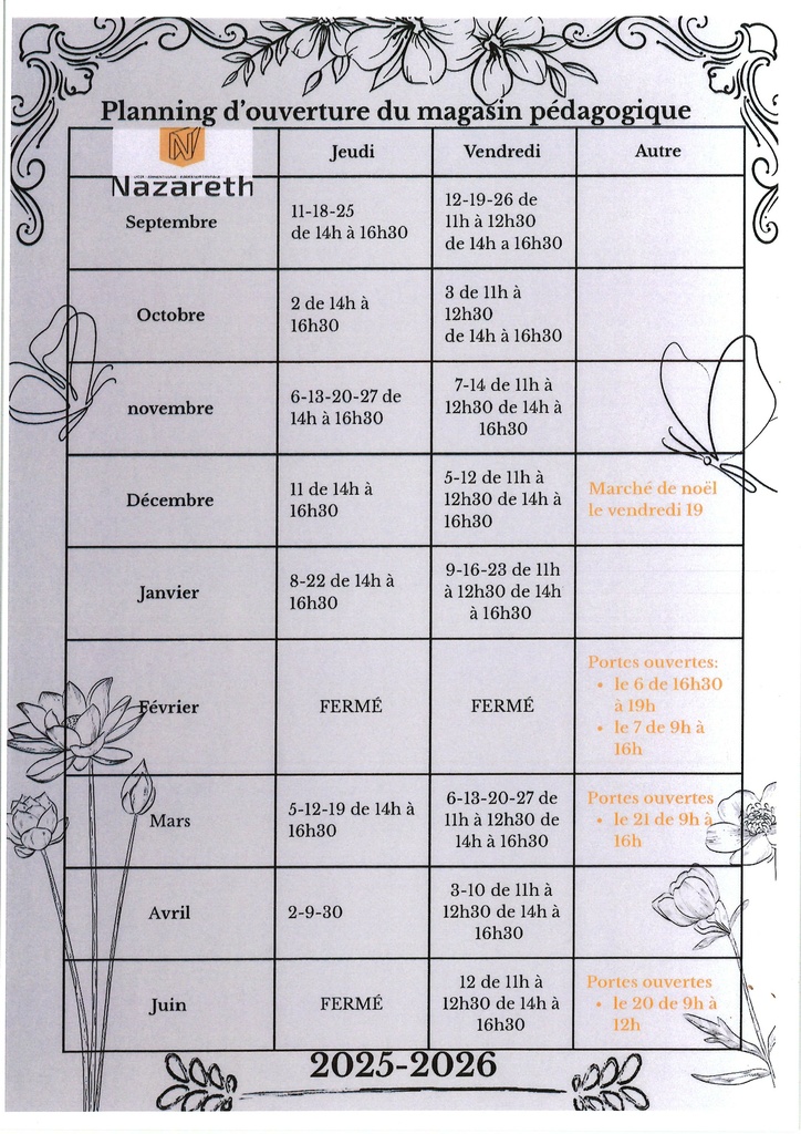 PLANNING D'OUVERTURE DU MAGASIN PÉDAGOGIQUE LPP NAZARETH 30/11/2025 Source : Mairie de Loir-en-Vallée