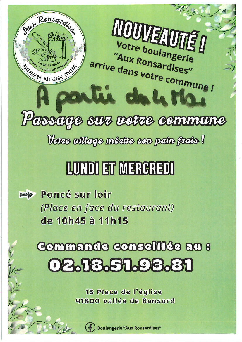 À partir du 04 mai, la boulangerie " Aux Ronsardises" sera de passage les lundi et mercredi de 10H45 à 11h15 sur La Place de La Fontaine Saint-Julien.