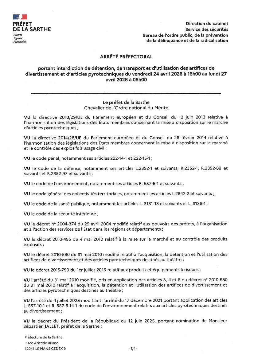 Arrêté préfectoral portant interdiction pyrotechnie 24/04/2026 . Source : Mairie de Montreuil-le-Henri