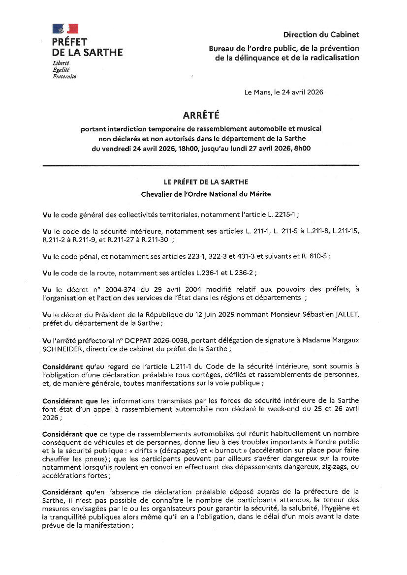 Arrêté préfectoral - rassemblement automobile et musical 24/04/2026 . Source : Mairie de Saint-Georges-de-la-Couée
