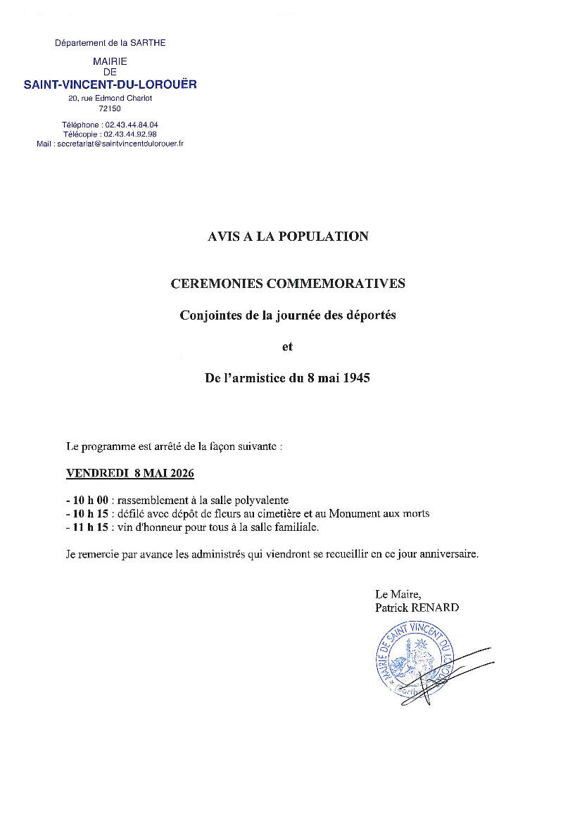 COMMEMORATION DU 8 MAI 1945 20/04/2026 Cérémonies Commémoratives de l'armistice de 1945 le Vendredi 8 Mai 2026 à partir de 10h. Source : Mairie de Saint-Vincent-du-Lorouër