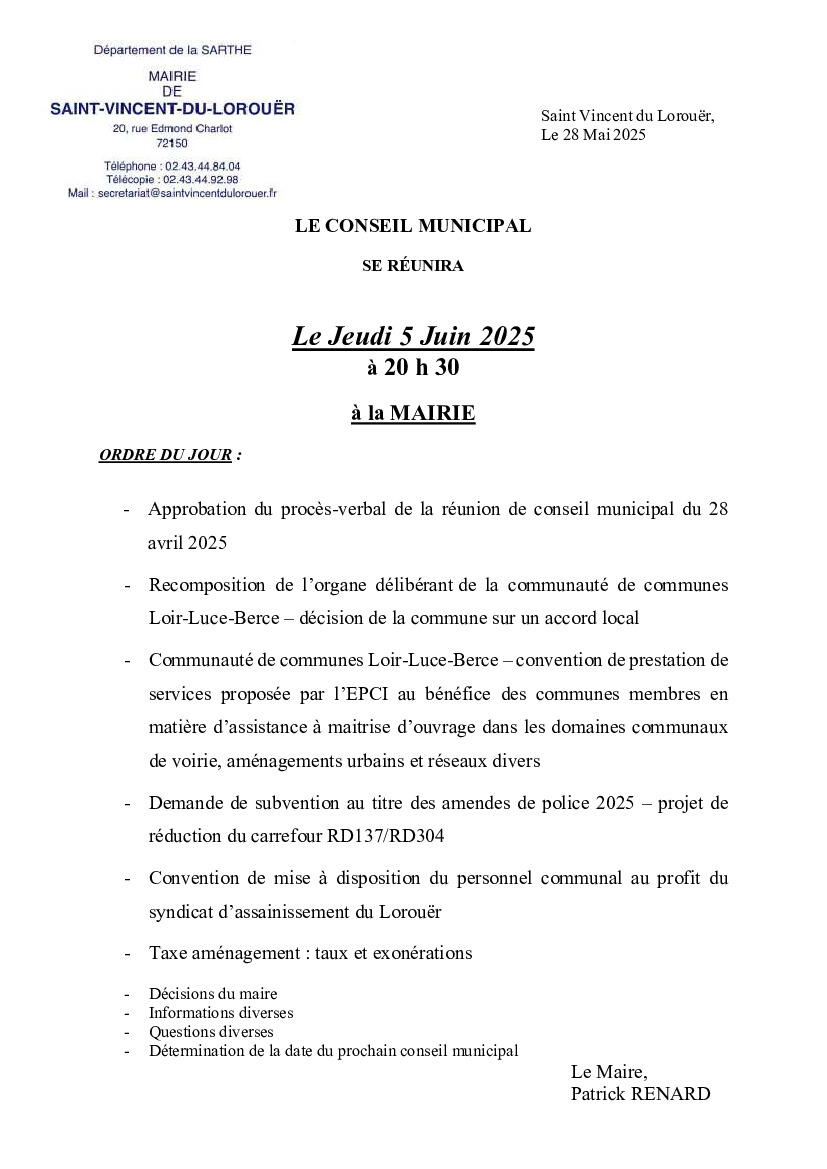 CONSEIL MUNICIPAL DU 5 JUIN 2025 28/05/2025 Conseil Municipal du Jeudi 5 Juin à 20h30 à la mairie. Source : Mairie de Saint-Vincent-du-Lorouër