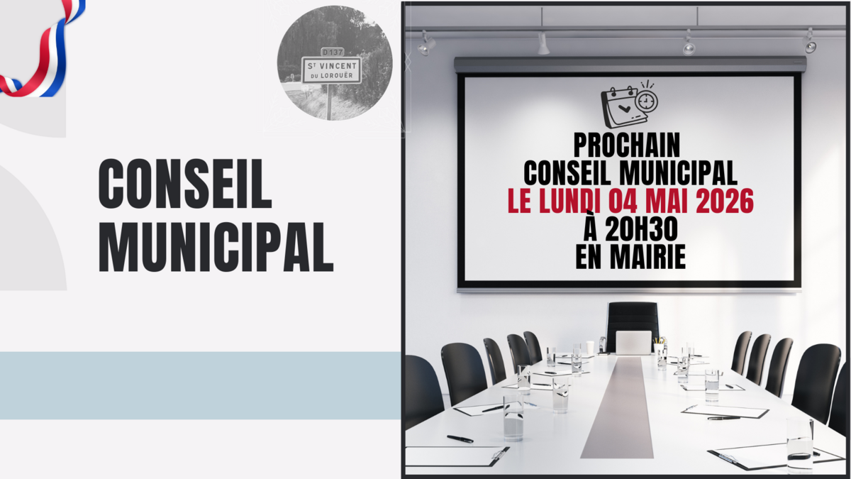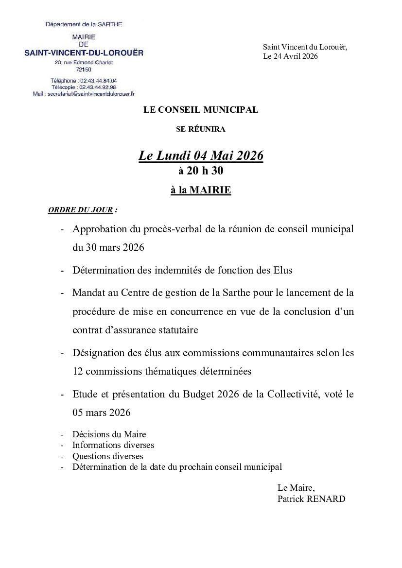 CONSEIL MUNICIPAL DU 04 MAI 2026 24/04/2026 Conseil Municipal du Lundi 04 Mai 2026 à 20h30 à la mairie. Source : Mairie de Saint-Vincent-du-Lorouër