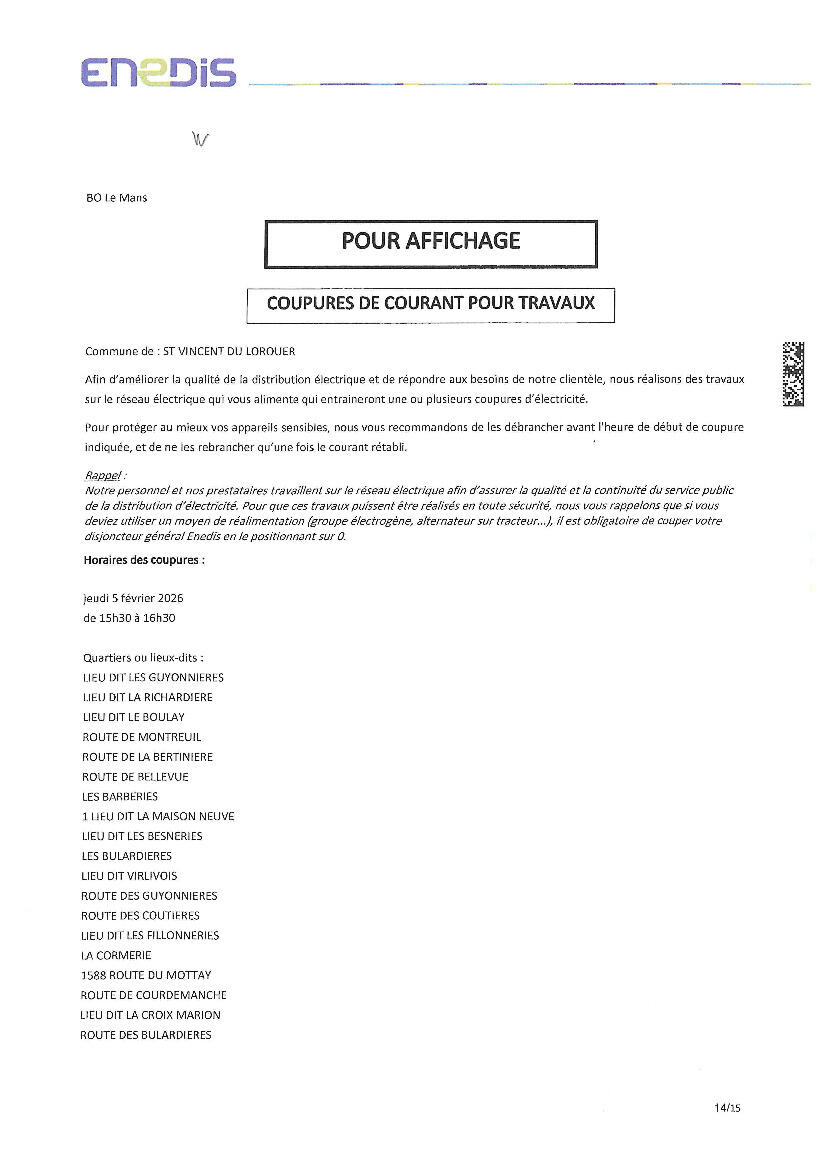 COUPURE ELECTRICITE JEUDI 5 FEVRIER 2026 de 15h30 à 16h30